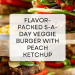 This vibrant 5-a-day burger is a delicious way to pack plenty of vegetables into one satisfying meal. Featuring a savory mushroom and butter bean patty, fresh panzanella salad, creamy avocado, and a tangy homemade peach ketchup, this burger is bursting with flavor and nutrition.