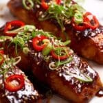 - Rest and Garnish: Remove the fish from the oven and transfer to serving plates. Let them rest for 5 minutes. Garnish with sliced green onions, red chili, and sesame seeds. Serve with sides like coconut rice and cucumber salad if desired.