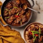 This Jamaican oxtail recipe features tender, flavorful oxtail slow-cooked in a rich marinade of onions, garlic, ginger, thyme, soy sauce, and spicy scotch bonnet peppers. Marinated overnight and then seared before simmering, the dish results in fall-off-the-bone meat infused with deep Caribbean flavors, traditionally served with white rice or rice and peas for a hearty, authentic meal.
