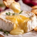 This Baked Brie recipe offers a warm, gooey cheese appetizer that’s perfect for gatherings or a cozy snack. Featuring creamy brie baked until soft and melted, then drizzled with honey and topped with fresh thyme for a hint of herbal aroma. Serve alongside crostini and grapes for a delightful balance of flavors and textures.