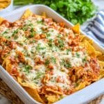 Keywords: Baked chilaquiles, Mexican casserole, enchilada sauce recipe, chilaquiles bake, shredded chicken, Mexican breakfast casserole