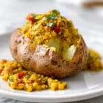 This comforting recipe pairs crispy baked potatoes with a flavorful and spicy red lentil dhal, enriched with aromatic spices and chickpeas. The dhal is simmered gently on the stovetop to create a creamy, protein-rich topping that perfectly complements the tender jacket potatoes, making for a hearty and satisfying meal.