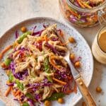 - Assemble the salad: If packing for lunch, divide the dressing into two small containers. Layer the shredded chicken, carrot matchsticks, shredded red cabbage, sliced red onion, sugar snap peas, and toasted sesame seeds into a separate container in the order listed. Top with the crispy chickpeas.