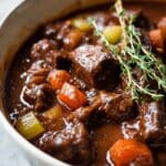 A rich and hearty Beef and Guinness Stew featuring tender chunks of beef slow-cooked in a savory blend of Guinness beer, bacon, and aromatic vegetables. Perfectly thickened and seasoned, this classic Irish-inspired stew is deliciously comforting and best served with creamy mashed potatoes.