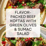 Keywords: beef koftas, sumac koftas, green olive koftas, Mediterranean kofta recipe, beef meatballs, grilled koftas, pickled onion salad, pistachio koftas, easy kofta recipe