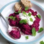 - Serve: Spoon the beetroot hummus into a serving bowl. Swirl in a little yogurt on top, then sprinkle toasted cumin seeds and torn fresh mint leaves. Serve with crusty bread for dipping or spreading.