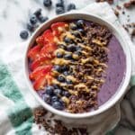 This breakfast bowl is best enjoyed fresh. If needed, store the blended base in an airtight container in the refrigerator for up to 24 hours. Add toppings just before serving to keep textures crunchy. Reblend if it thickens too much.