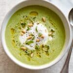 This broccoli and pea soup with minty ricotta is a fresh, vibrant dish perfect for light lunches or comforting dinners. Blended to a smooth texture and topped with herby ricotta and crunchy pine nuts, it offers a delightful balance of flavors and textures.