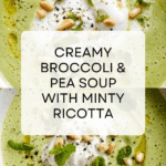 Keywords: broccoli soup, pea soup, minty ricotta, healthy soup, easy lunch, vegetarian recipe