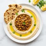 - Step 5: Transfer the hummus to a serving plate or bowl. Top with the reserved chickpeas, fresh thyme, and remaining caramelized onions. Drizzle with olive oil before serving.