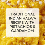 A rich and aromatic traditional Indian Halwa made with semolina, ghee, pistachios, and flavored with cardamom and orange food coloring. This sweet dessert is toasted to golden perfection and cooked with a fragrant sugar syrup, perfect served warm with puris or parathas.