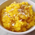A rich and aromatic traditional Indian Halwa made with semolina, ghee, pistachios, and flavored with cardamom and orange food coloring. This sweet dessert is toasted to golden perfection and cooked with a fragrant sugar syrup, perfect served warm with puris or parathas.