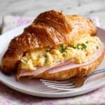 - Fill and Serve: Spoon the scrambled eggs over the ham, close the croissant sandwich, and serve immediately for the best texture and flavor.