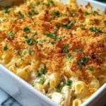 This Cheesy Chicken Noodle Casserole is a comforting and satisfying baked dish featuring tender cooked chicken, wide egg noodles, a creamy blend of sour cream and cream of chicken soup, and a melty combination of cheddar and mozzarella cheeses, topped with a buttery, crunchy cracker crust. Perfect for family dinners or potlucks, it’s easy to prepare and packed with rich, savory flavors.