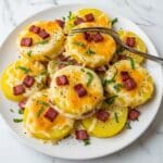 A comforting and indulgent casserole featuring thinly sliced Yukon Gold potatoes layered with a rich, creamy cheese sauce made from cheddar and Gruyere cheeses, fragrant herbs, caramelized onions, garlic, and diced ham. This baked cheesy scalloped potatoes and ham dish is perfect as a hearty side or main course, finished with a golden parmesan crust and fresh parsley for added flavor and color.