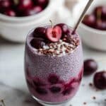 A simple and delicious Cherry Chia Pudding recipe featuring creamy dairy-free chia pudding topped with a homemade warm cherry sauce. This nutritious, vegan-friendly dessert or breakfast is naturally sweetened with maple syrup and finished with a hint of almond extract for a delightful flavor twist.