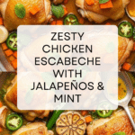 Chicken Escabeche is a flavorful dish featuring tender chicken thighs simmered in a tangy vinegar sauce with jalapeños, golden raisins, and fresh mint. This recipe brings a perfect balance of sweet, spicy, and aromatic flavors that will delight your palate.
