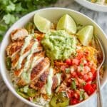 - Assemble the bowls: Divide the cooked rice evenly among four bowls. Layer pinto beans over the rice, then top with the sautéed peppers, onions, and sliced chicken fajita meat. Garnish each bowl with shredded Mexican blend cheese, pico de gallo, guacamole, fresh cilantro sprigs, and a wedge of lime.