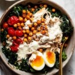 A vibrant and nutrient-packed Chicken Kale Salad featuring tender roasted tomatoes, crispy spiced chickpeas, shredded cooked chicken, and massaged Tuscan kale. Tossed in a creamy tahini-lemon dressing and topped with soft-boiled eggs and parmesan for a satisfying meal that balances fresh vegetables and hearty protein.