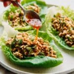 You can prepare the filling and sauces ahead, but it’s best to assemble the wraps just before eating to keep the lettuce crisp and fresh.