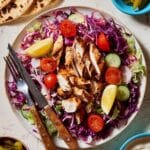 Keywords: chicken shawarma, shawarma salad, grilled chicken, Middle Eastern salad, tahini dressing, healthy chicken recipe