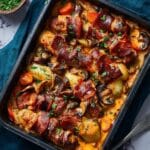A festive and hearty Christmas pork in blankets casserole, featuring roasted root vegetables, succulent pigs in blankets, and a rich, flavorful sausage casserole sauce, finished with fresh herbs and an optional creamy swirl. Perfect for a cozy holiday meal served with mashed potatoes or leftover roasties.