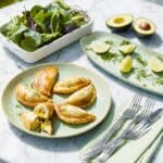 - Serve the empanadas with avocado and lime: halve a ripe avocado, remove the stone, and scatter with coriander leaves. Squeeze fresh lime juice over the avocado and serve alongside the empanadas for a fresh, creamy contrast.