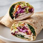 This Cranberry Apple Slaw Turkey Wrap is a fresh, crunchy, and flavorful lunch option combining tender turkey breast with a vibrant slaw of green and red cabbage, apple, dried cranberries, and carrots. The creamy Greek yogurt dressing is tangy and slightly sweet with apple cider vinegar and honey, perfectly complementing the crisp slaw and savory turkey. Wrapped in whole wheat tortillas with baby spinach, these wraps are easy to assemble, portable, and satisfying for a nutritious meal on the go.