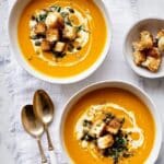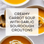 A rich and velvety creamy carrot soup made with tender carrots, aromatic vegetables, and fresh thyme, topped with crunchy home-baked seeded sourdough croutons and a touch of double cream for extra indulgence.