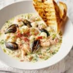 This creamy seafood stew combines a delightful mix of tender seafood with a rich, flavorful broth thickened with cornflour and enriched with crème fraîche. Infused with aromatic dill and served alongside crispy garlic bread, it makes a comforting and elegant meal perfect for any occasion.