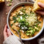 - Finish and serve: Remove the pot from the heat and stir in the chopped fresh cilantro. If the chili is too thick, thin it with the remaining chicken broth to your desired consistency. Ladle the chili into bowls and garnish with yogurt or sour cream, additional cheddar cheese, sliced avocado, fresh cilantro, green onions, and a zest and squeeze of fresh lime juice. Serve immediately and enjoy the creamy, flavorful chili.
