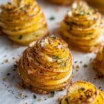 - Cool and Garnish: Remove from the oven and let the potato stacks cool on the baking sheet for 5 minutes. Transfer the stacks to a serving platter and garnish with additional freshly ground black pepper, finely chopped parsley, and a sprinkle of flaky sea salt for an added touch of flavor and texture.