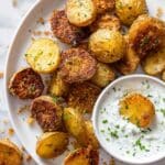 Keywords: Parmesan potatoes, roasted potatoes, crispy potatoes, side dish, baby potatoes, sour cream dip, appetizer