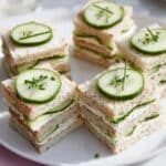 - Layer the sandwiches: Place two slices of cucumber-topped bread on top of each other, then add a plain slice of bread on top. Repeat this layering process twice more to create triple-deckers.