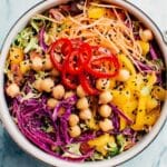 - Add Vegetables and Mango: Toss the julienned or grated carrot, shredded red cabbage, shredded baby spinach, and finely diced mango into the chickpea mixture. Mix thoroughly to incorporate all the fresh, crunchy, and sweet elements.