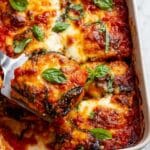 This classic Italian Eggplant Parmigiana (Parmigiana di Melanzane) features thinly sliced baked eggplants layered with a rich homemade tomato sauce, fragrant fresh basil, and a blend of parmesan and mozzarella cheeses. Slowly baked to bubbly perfection, this hearty vegetarian dish offers a deliciously comforting meal inspired by southern Italy.