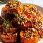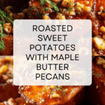 A comforting and elegant recipe featuring sweet potatoes slow-roasted fondant style with a savory chicken stock glaze, topped with a rich maple butter pecan sauce and fresh thyme for an irresistible balance of sweet and savory flavors.