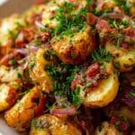 A classic German Potato Salad featuring tender baby red potatoes coated in a tangy, warm dressing of crispy bacon, red onion, apple cider vinegar, and fresh herbs. This salad is perfect served warm or at room temperature, making it a versatile side dish with a balance of smoky, sweet, and tangy flavors.