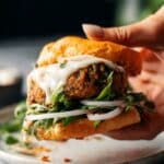 These Ginger Chicken Meatball Sandos are a delicious fusion sandwich featuring tender, flavorful chicken meatballs infused with garlic, ginger, serrano pepper, and fresh herbs. Cooked on the stovetop to a golden brown perfection and served in warm, soft bread with a creamy mayo base, fresh cucumber, shallots, and a delightful chili crisp drizzle, these sandwiches offer a messy, saucy, and flavor-packed experience perfect for a hearty meal.
