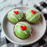 These festive Grinch Hot Chocolate Bombs are a fun and delicious holiday treat. Made with vibrant green candy melts to form the chocolate shell, filled with rich Swiss Miss hot chocolate mix and marshmallows, they melt beautifully in hot milk to create a creamy, comforting drink. The bombs are sealed by gently melting the edges on a stovetop pan and decorated with drizzled white chocolate and a cute heart accent, making them a perfect gift or seasonal indulgence.