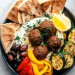 - Serve: Plate the roasted meatballs and vegetables alongside dollops of hummus and whipped feta. Garnish with pita wedges, kalamata olives, and lemon wedges for squeezing. Enjoy immediately.