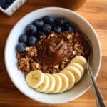 A simple and nutritious Breakfast Bowl featuring a blend of unsweetened coconut yogurt, crunchy granola, fresh banana slices, juicy blueberries, and a rich spoonful of chocolate almond butter. Perfect for a quick, wholesome start to your day.