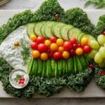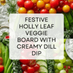 Create a festive Holly Leaf Veggie Board perfect for holiday gatherings, featuring fresh broccoli, cucumbers, bell peppers, sugar snap peas, and a creamy dill yogurt dip. This vibrant veggie board is both healthy and visually stunning, perfect as a party appetizer or snack.
