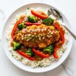 This Honey Garlic Chicken recipe features tender, lightly battered chicken breasts seared to golden perfection and simmered in a rich, flavorful honey garlic sauce with colorful broccoli and red bell peppers. Served over steamed rice, it’s an easy, satisfying dish that balances sweet, savory, and slightly spicy flavors for a delicious home-cooked meal.