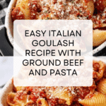 Italian Goulash is a hearty one-pot meal featuring ground beef simmered with stewed tomatoes, tomato sauce, sautéed onions, green bell peppers, and garlic, combined with tender medium shell pasta and topped with Parmesan cheese. This comforting and flavorful dish is easy to prepare and perfect for a satisfying weeknight dinner.