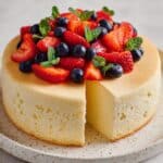 - Decorate and serve: Once cooled, decorate the cheesecake with fresh strawberries, blueberries, and a few mint leaves to add color and fresh flavor before serving. Store any leftovers covered and chilled for up to five days.