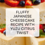 This delicate Japanese cheesecake, also known as chizu keki, is a light and fluffy dessert combining soft cheese with a hint of yuzu for a refreshing citrus twist. Baked in a water bath, this cake has a melt-in-your-mouth texture perfect for those who enjoy a less dense cheesecake. Finished with fresh strawberries, blueberries, and mint leaves, it makes for an elegant and delicious treat.