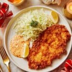 - Serve: Plate schnitzels with the kimchi mayonnaise and crisp cabbage salad on the side. Add lemon wedges for squeezing over the top for freshness.