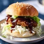 These Korean fried chicken burgers feature ultra-crisp chicken thighs double-fried to perfection and smothered in a sticky, sweet-spicy gochujang sauce. Served with a crunchy ginger and mooli slaw on toasted brioche or sesame seed buns, these burgers deliver a satisfying combination of textures and bold Korean-inspired flavors perfect for a flavorful meal.