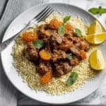 - Serve: Spoon the lamb and apricot stew over cooked couscous, garnish with fresh mint or coriander leaves, and serve with lemon wedges on the side for squeezing over.